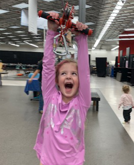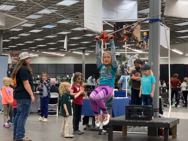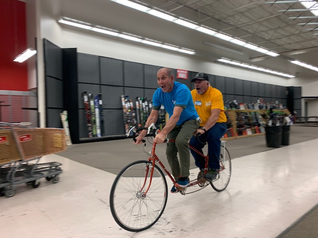Project Discovery enjoyed the weekend entertaining the kids with an indoor zip line at the annual Skytavern Ski Swap. We were in turn entertained by Tom Raw and Bill Henderson surviving their “Bicycle Built For Two” experience riding around the venue! My point: everyone had a good time as they always do with the Skytavern Junior Ski Program and Project Discovery!